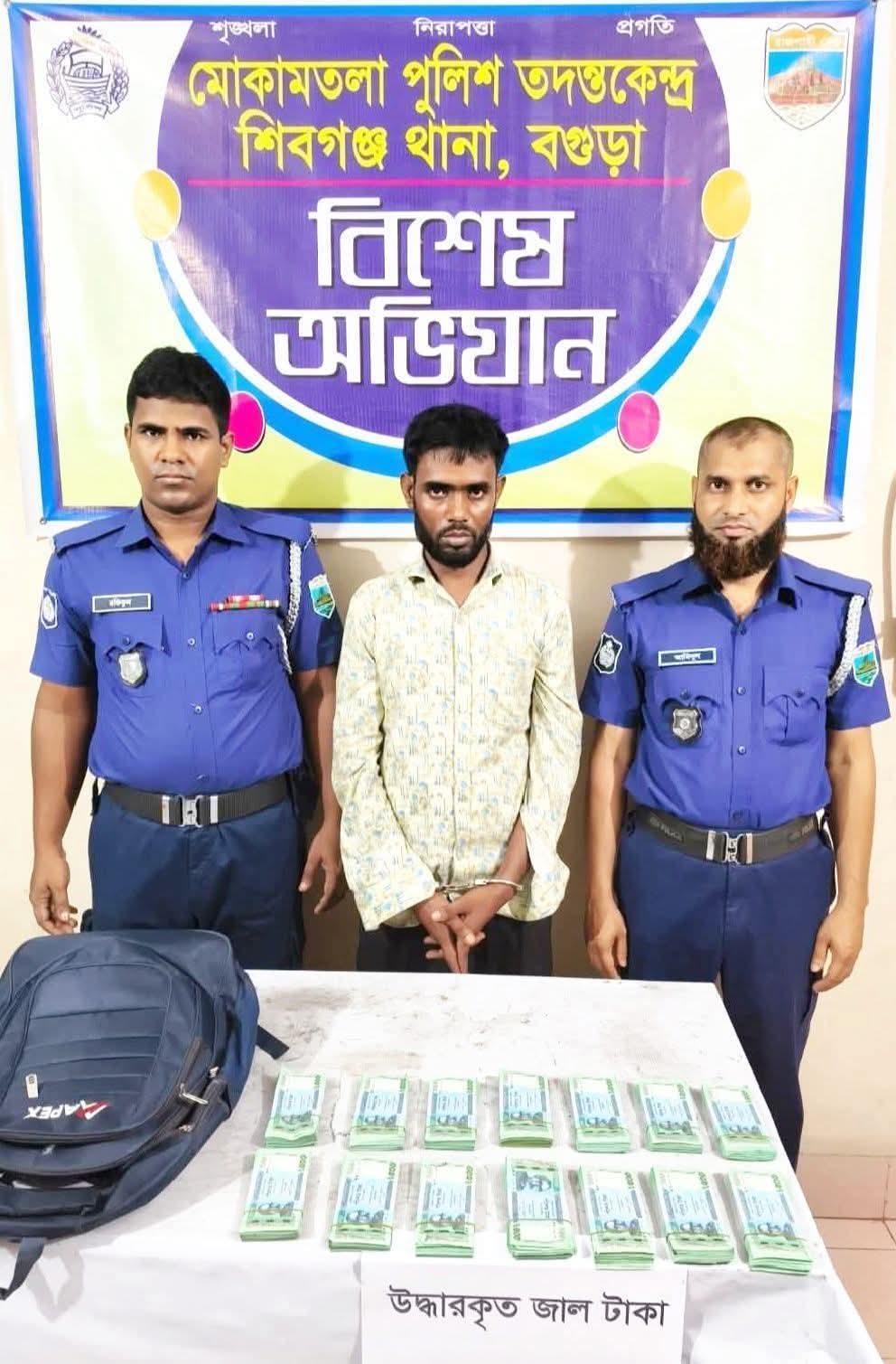 বগুড়ার শিবগঞ্জ উপজেলার মোকামতলা পুলিশ তদন্ত কেন্দ্রের বিশেষ অভিযানে এক ব্যক্তিকে হাতেনাতে গ্রেফতার করা হয়েছে। অভিযানের সময় তার কাছ থেকে ১ হাজার ৪ শতটি ৫০০ টাকার জাল নোট উদ্ধার করা হয়, যার মোট মূল্য ৭,০০,০০০ টাকা।