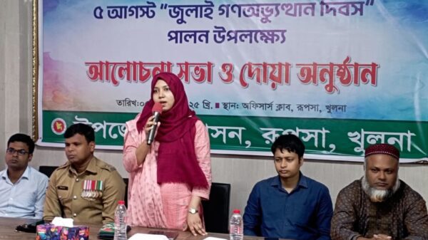 রূপসায় ‘জুলাই গণঅভ্যুত্থান দিবস’ উপলক্ষে আলোচনা সভা ও দোয়া অনুষ্ঠিত 📍 প্রতিবেদক: মোহাম্মদ আব্দুল্লাহ | খুলনা-রূপসা প্রতিনিধি, সত্যকণ্ঠ ‘জুলাই গণঅভ্যুত্থান দিবস’ উপলক্ষে আলোচনা সভা ও দোয়া মোনাজাত অনুষ্ঠিত হয়েছে