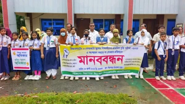 উল্লাপাড়ায় প্রাথমিক বৃত্তি পরীক্ষায় অংশগ্রহণের দাবিতে শিক্ষার্থী ও অভিভাবকদের মানববন্ধন